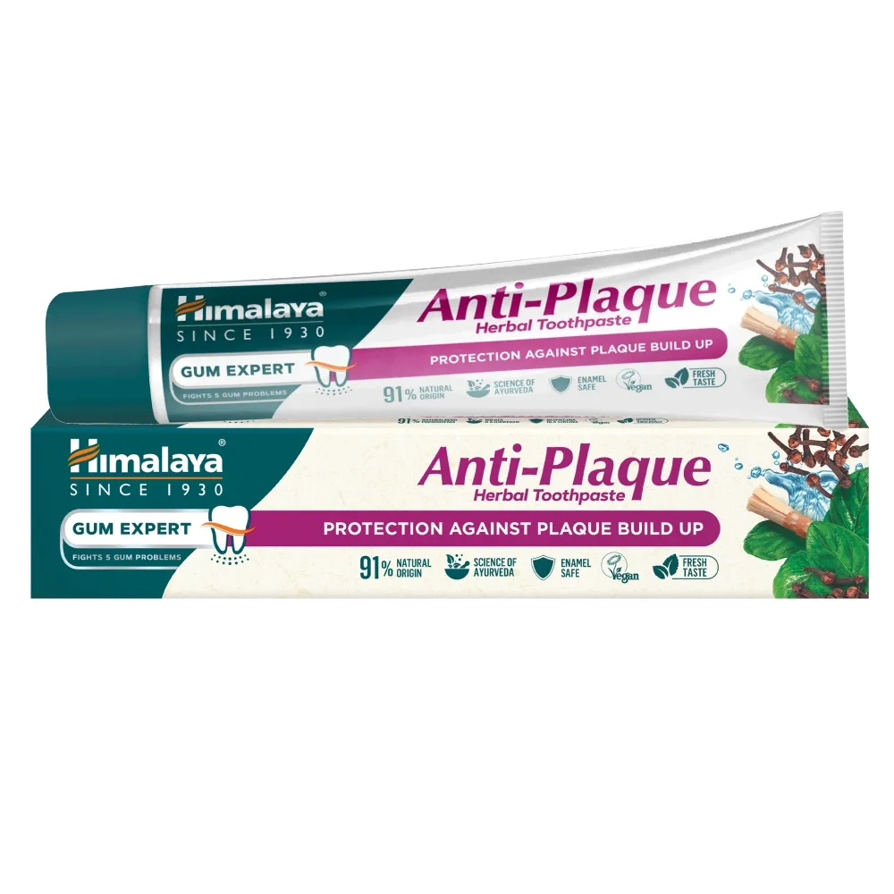 Ziołowa pasta do zębów Himalaya Gum Expert Anti-Plaque wykorzystuje technologię Naturalnych Enzymów Roślinnych z papai i ananasa. Składniki te wpływają na poprawę bieli zębów oraz usuwają przebarwienia z ich powierzchni. Ekstrakt ze szpinaku oraz naturalny azotan potasu (Suryakshara) chronią szkliwo oraz zmniejszają nadwrażliwość kontaktową zębów. Pasta jest w 100% wegetariańska, nie zawiera fluoru oraz chemicznych wybielaczy.