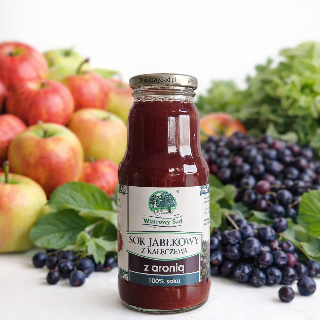 Sok jabłkowo-aroniowy jest tłoczony z całych owoców bez dodatku wody i konserwantów. Zachowuje bogaty smak oraz wszystkie wartości odżywcze, które wspierają zdrowie. Naturalna mętność soku świadczy o jego wysokiej jakości i świeżości składników. Sok jabłkowy z dodatkiem soku z aronii to orzeźwiająca mieszanka, która łączy naturalną świeżość jabłek z wyjątkowym smakiem aronii. Dzięki wysokiej zawartości witamin C i E oraz antyoksydantom, wspomaga układ odpornościowy, poprawia krążenie i neutralizuje działanie wolnych rodników. To doskonały wybór dla tych, którzy pragną zdrowego i pysznego napoju pełnego energii!