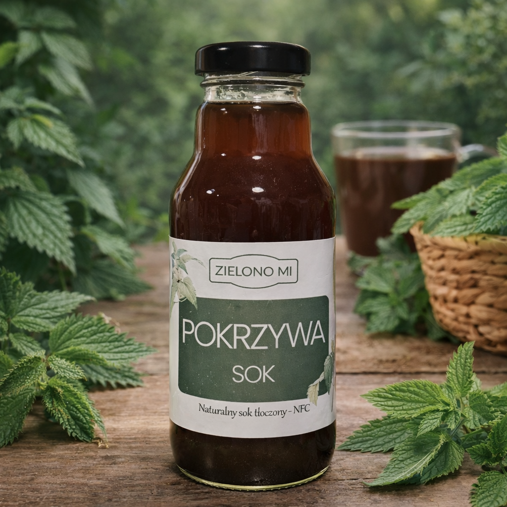 Sok z pokrzywy 100% to naturalny, jednoskładnikowy produkt pozyskiwany ze świeżych liści pokrzywy, tłoczonych na zimno w celu zachowania ich charakterystycznego smaku i roślinnego aromatu. Sok nie zawiera dodatku cukru, wody, aromatów ani konserwantów, dzięki czemu wyróżnia się czystym składem i pełnią naturalnych właściwości roślinnych.